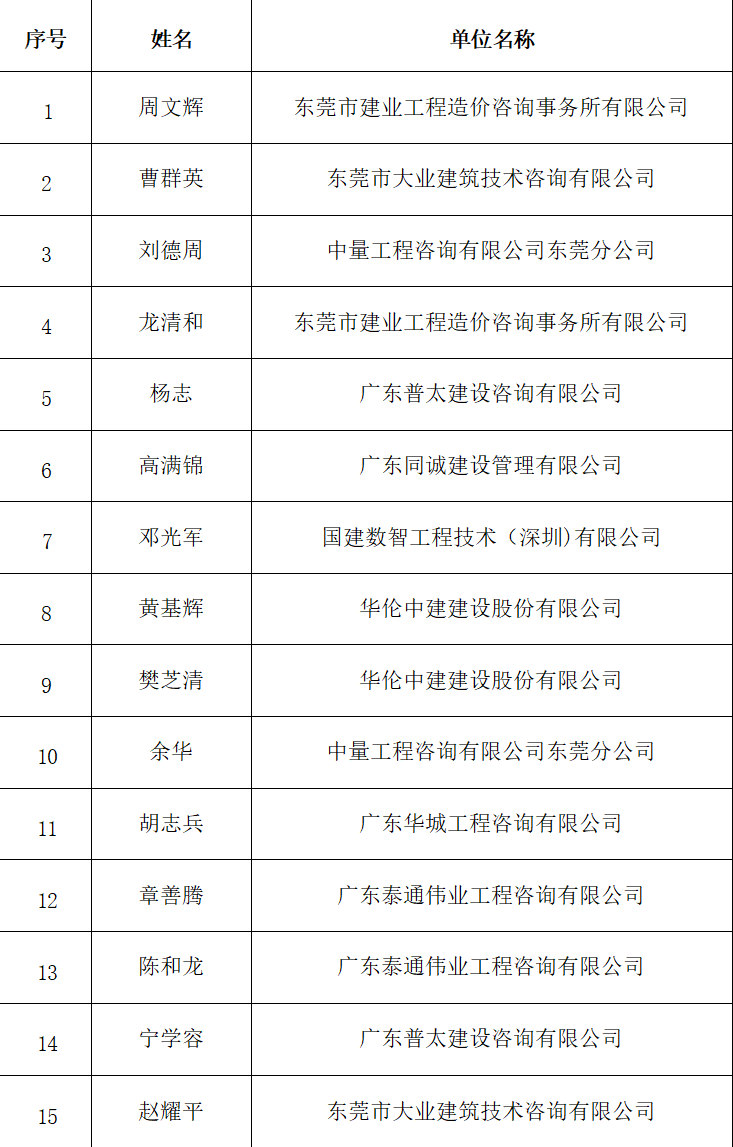 根据《关于开展‘2024年度东莞市工程造价行业协会优秀造价师’评选活动的通知》(东价协[2025]8号)文件要求,我协会组织开展了该项活动,并将评选结果予以公示,公示期已满,现将评选结果公布如下。