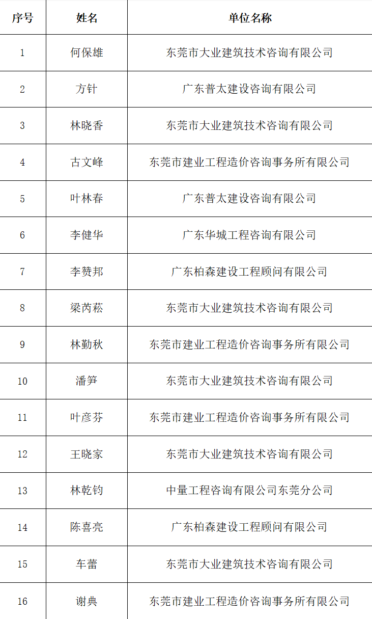 关于公布‘2024年度东莞市工程造价行业协会优秀造价师’评选结果的公示