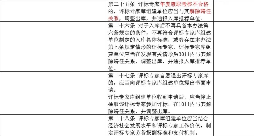 第二十五条 评标专家年度履职考核不合格的,评标专家库组建单位应当与其解除聘任关系,调整出库,并通报入库推荐单位。